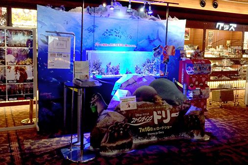 7/16に公開となる『ファインディングドリー』にあわせて、主役のドリーこと『ナンヨウハギ』や、ニモでおなじみの『カクレクマノミ』などの魚たちが、愛嬌をふりまきながらも優雅に泳ぎまわる海中の世界を、幅1.5メートルの水槽で表現してみました。